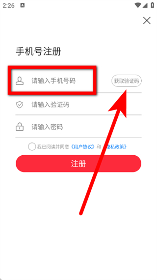 4、在注冊頁面,輸入手機(jī)號碼,點(diǎn)擊獲取驗(yàn)證碼。