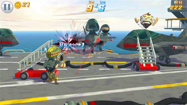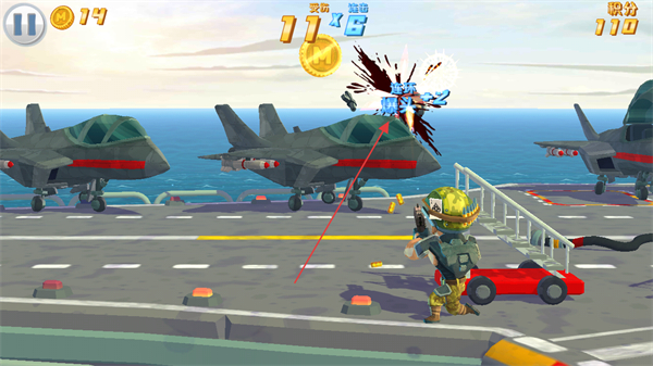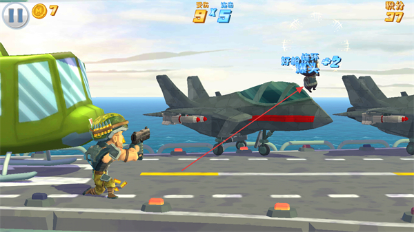2、在航母場景中,點擊敵人如飛機旁的目標(biāo)進行射擊,積累分數(shù)和金幣。