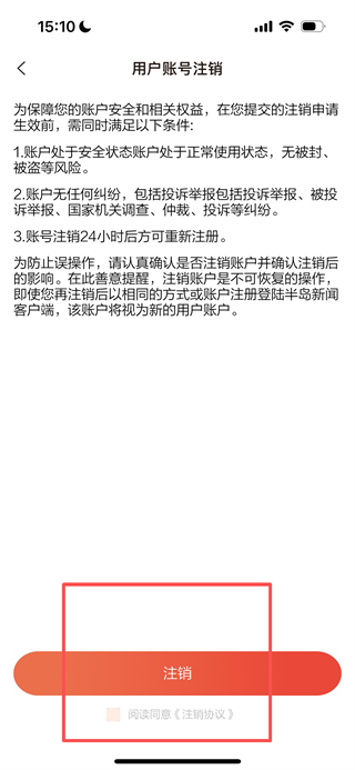 4、在注銷頁面,勾選同意協(xié)議后點擊注銷按鈕,完成注銷操作。