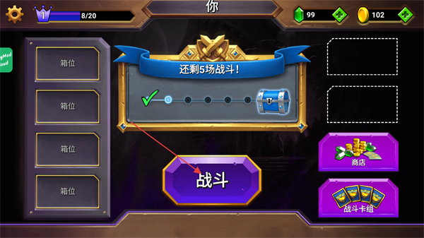 1、在當(dāng)前界面查看進(jìn)度提示,點(diǎn)擊戰(zhàn)斗按鈕即可開(kāi)啟對(duì)局,也可通過(guò)商店、戰(zhàn)斗卡組完成戰(zhàn)前準(zhǔn)備。