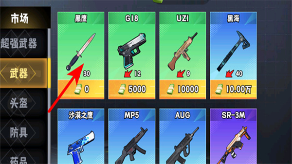2、進(jìn)入武器商店界面后,選擇目標(biāo)武器如黑鷹的匕首,這是提升戰(zhàn)斗能力的基礎(chǔ)操作,選定后可獲取對應(yīng)的武器裝備,增強生存防御能力。