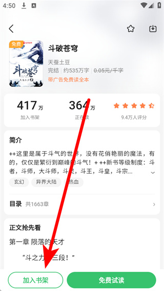 4、在小說(shuō)詳情頁(yè)的底部,點(diǎn)擊加入書(shū)架,即可將該小說(shuō)添加到你的書(shū)架中。