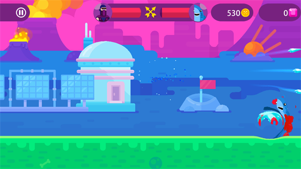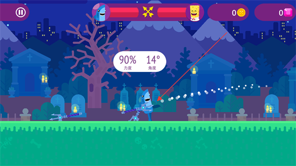 1、進(jìn)入該游戲的戰(zhàn)斗環(huán)節(jié)后,通過(guò)拖動(dòng)角色手中的武器調(diào)整發(fā)射角度來(lái)控制攻擊的發(fā)射,目標(biāo)是敵方角色以削減其血條。