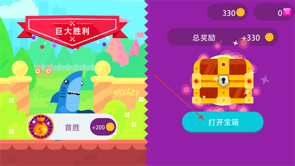 4、戰(zhàn)斗獲勝后會(huì)出勝利的標(biāo)識(shí),若為首次獲勝還會(huì)有首勝對(duì)應(yīng)的額外獎(jiǎng)勵(lì),同時(shí)可點(diǎn)擊打開(kāi)寶箱來(lái)領(lǐng)取此次戰(zhàn)斗對(duì)應(yīng)的總獎(jiǎng)勵(lì)。