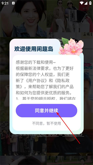 1、在歡迎使用閑趣島彈窗中,點(diǎn)擊同意并繼續(xù),進(jìn)入閑趣島主頁(yè)面。