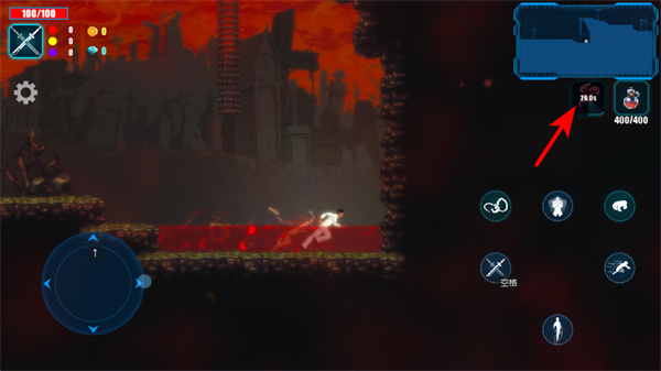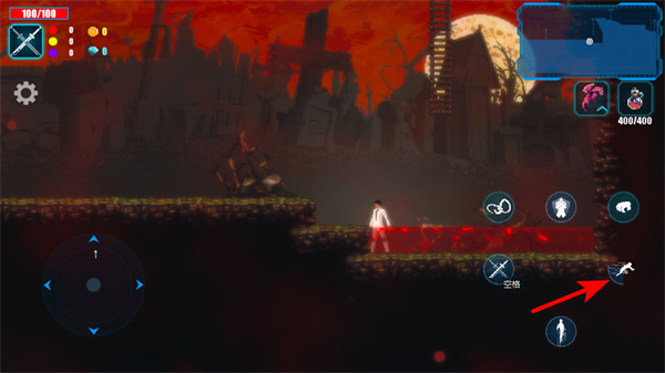 3、點(diǎn)擊位移類技能按鈕,這是跨越地形障礙的核心操作,使用后可讓角色快速移動(dòng)到高處平臺,避開地面的危險(xiǎn)區(qū)域,繼續(xù)向目標(biāo)前進(jìn)。