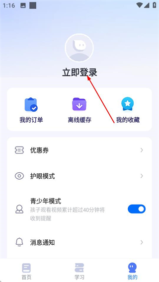 1、在領(lǐng)世優(yōu)學(xué)首頁(yè),點(diǎn)擊底部的我的選項(xiàng),進(jìn)入個(gè)人中心頁(yè)面。