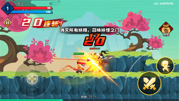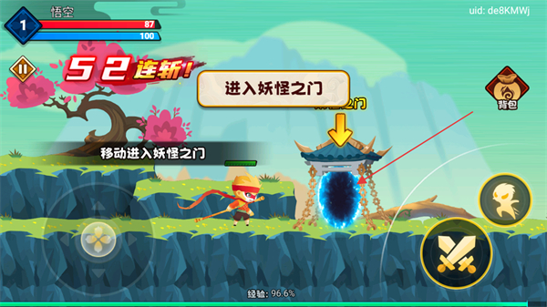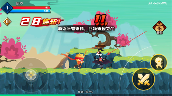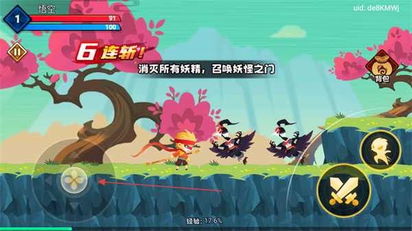1、操控左側(cè)移動(dòng)鍵控制悟空移動(dòng),攻擊妖精觸發(fā)6連斬!,推進(jìn)消滅妖精的進(jìn)度。