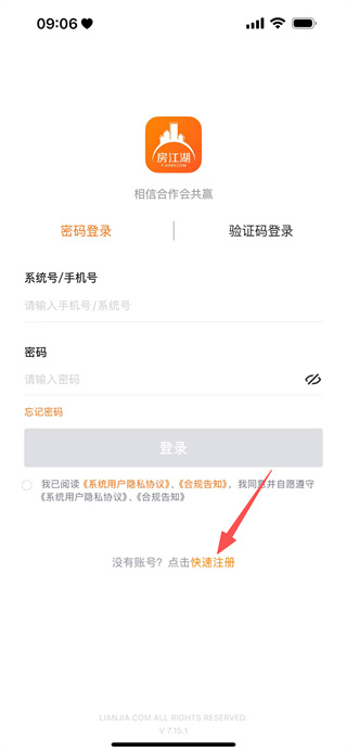 2、在登錄頁面,點擊點擊快速注冊選項,進入創(chuàng)建房江湖賬號的頁面。