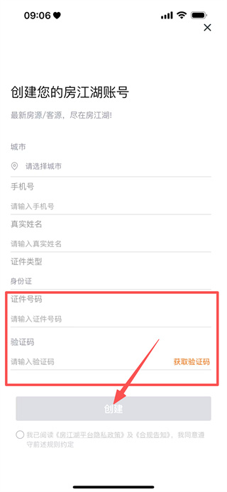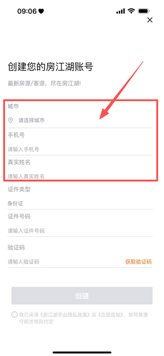 3、在創(chuàng)建房江湖賬號頁面,填寫請選擇城市、手機號、真實姓名對應(yīng)的信息。