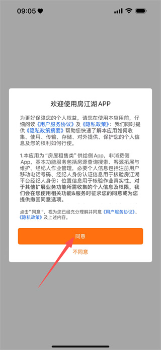 1、在房江湖APP歡迎彈窗中,點擊同意,即可進入登錄頁面。
