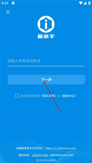 3、在登錄頁(yè)面,填寫手機(jī)號(hào)或賬號(hào),勾選協(xié)議后,即可點(diǎn)擊下一步。