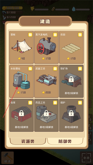 2、進(jìn)入建造界面后,可選擇營帳、蒸汽發(fā)電機等設(shè)施,消耗對應(yīng)資源建造,點擊建造水處理站,這是居民生存的重要資源獲取方式。
