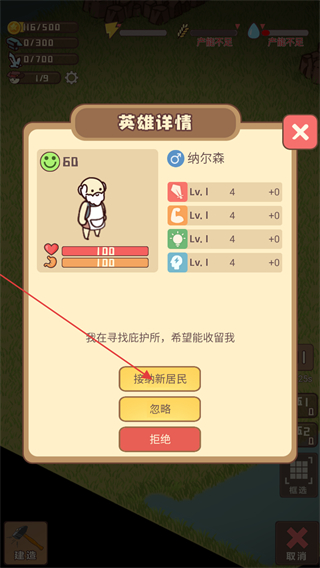 4、在英雄詳情界面中,點擊接納新居民按鈕,可招募該居民加入基地,助力基地的各項生產(chǎn)與運營事務(wù)開展。