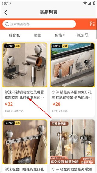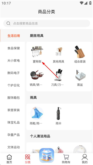 2、在分類頁面,選擇廚房用具下的置物架選項(xiàng),進(jìn)入對應(yīng)商品列表頁。
