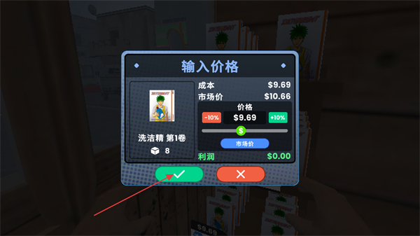 4、將取到的漫畫放入貨架并輸入價格,查看洗潔凈第1卷的成本價與市場價,確認定價后點擊對應按鈕完成價格設置。