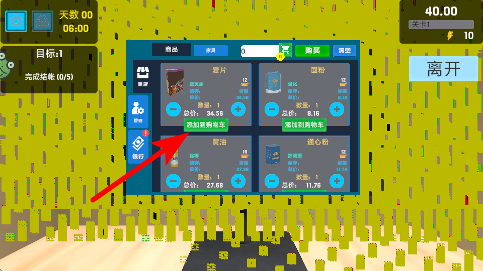 1、在商店界面點(diǎn)擊添加到購物車按鈕,這是采購商品的關(guān)鍵操作,點(diǎn)擊后可將麥片等商品加入購物車,為后續(xù)結(jié)算與經(jīng)營儲備物資。