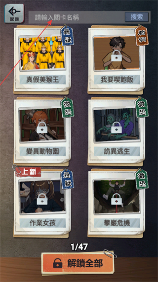 3、這是關(guān)卡選擇界面,可通過頂部搜索框輸入關(guān)卡名搜索,也能選擇懸疑、腦洞、微恐等分類下的關(guān)卡。