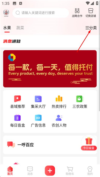 1、在一鄉(xiāng)一品首頁,點擊右上角的三分類選項,進(jìn)入商品分類頁面。
