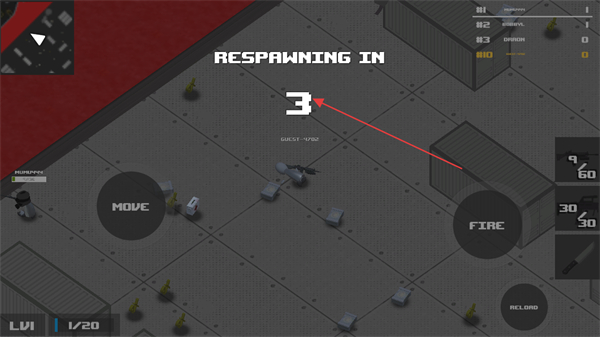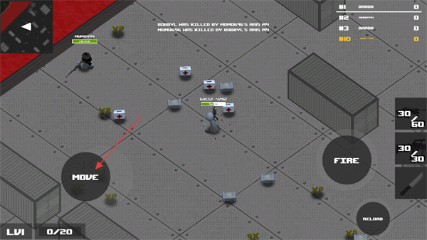 2、進(jìn)入游戲后,通過滑動MOVE按鈕操控角色移動,可拾取場景中的醫(yī)療箱恢復(fù)血量,收集XP道具提升等級進(jìn)度。
