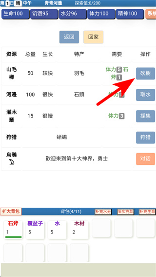 1、點(diǎn)擊砍樹選項(xiàng)采集對(duì)應(yīng)資源,這是積累生存物資的關(guān)鍵操作,采集后可獲取木材等材料,為后續(xù)建造或制作道具提供資源支持。