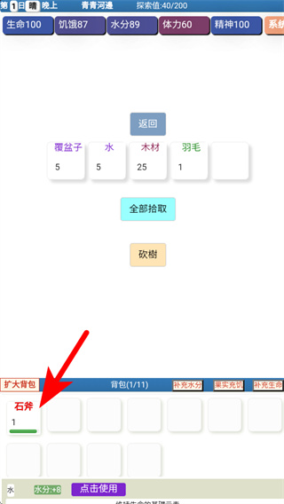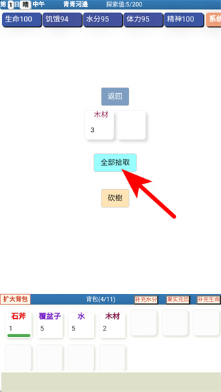 2、點(diǎn)擊全部拾取按鈕收集資源,這是整合探索收獲的基礎(chǔ)操作,拾取后可將當(dāng)前地點(diǎn)的物資存入背包,避免資源遺漏或浪費(fèi)。