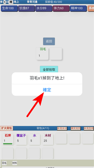 4、點(diǎn)擊確定按鈕確認(rèn)物品掉落提示,這是處理背包溢出的重要操作,確認(rèn)后可關(guān)閉提示界面,繼續(xù)開展資源采集或探索行動(dòng)。