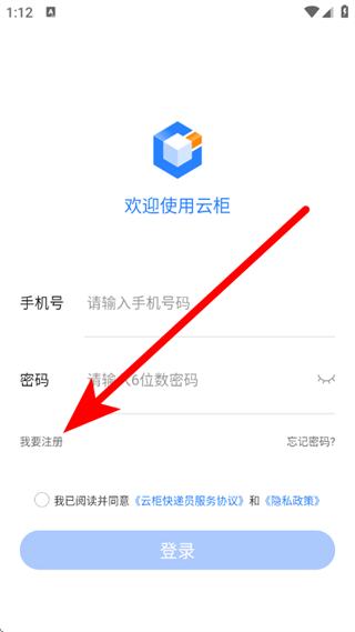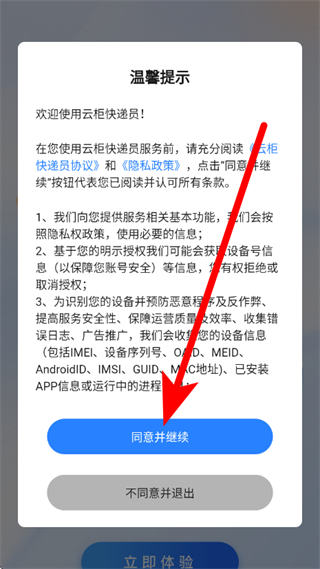 1、打開云柜快遞員,在彈出溫馨提示框,點擊同意并繼續(xù),進入登錄界面。