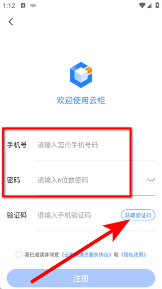 3、在注冊頁面,輸入手機號碼和密碼,點擊獲取驗證碼。