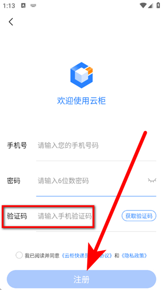 4、輸入手機驗證碼并勾選協(xié)議后,點擊注冊,完成注冊操作。