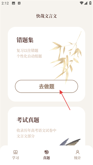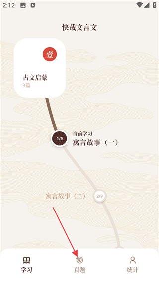 1、在快哉文言文學習頁面,點擊底部的真題選項,進入真題頁面。