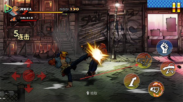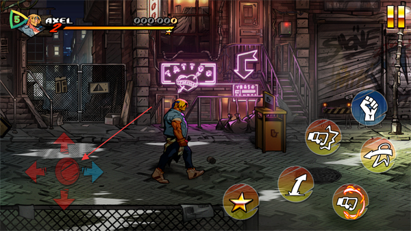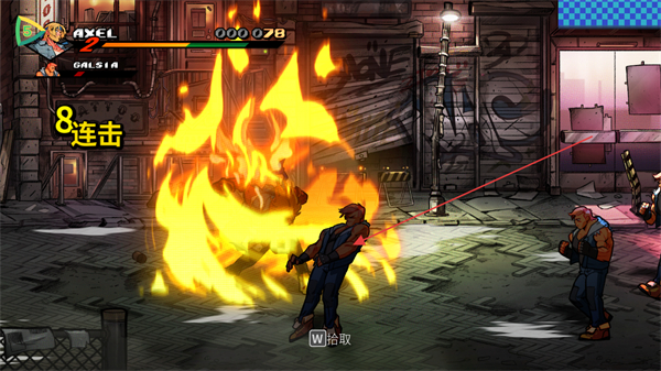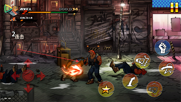 延續(xù)系列標(biāo)志性的橫版卷軸格斗玩法,玩家操控角色在街道、倉庫、霓虹小巷等場景中推進(jìn),通過組合拳、必殺技與武器拾取擊潰成群敵人。