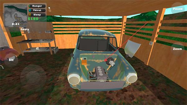 3、進入車庫場景后,找到展示的汽車,查看其引擎區(qū)域的部件,為后續(xù)的汽車修復相關操作做準備。