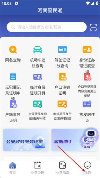 1、在河南警民通首頁,點(diǎn)擊底部的我的選項(xiàng),進(jìn)入個人頁面。