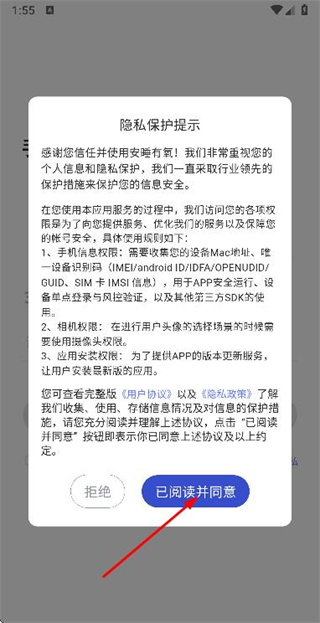 1、在使用協(xié)議隱私政策彈窗中點(diǎn)擊已閱讀并同意,進(jìn)入登錄頁面。