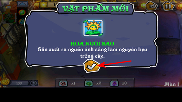 1、獲取新道具后點(diǎn)擊對(duì)勾按鈕,確認(rèn)解鎖HOANG SAO,這是獲取資源植物的操作,該植物可產(chǎn)出種植所需資源。