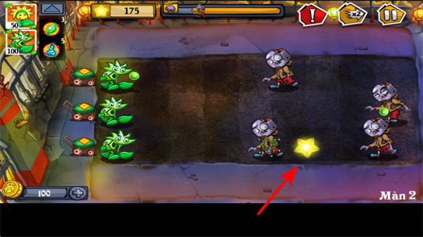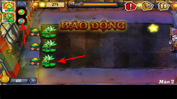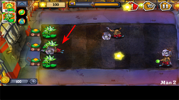 2、游戲中依照箭頭指引布置植物,讓植物攻擊靠近的僵尸,這是防御僵尸的基礎(chǔ)操作,按此布置可阻擋僵尸前進(jìn)。