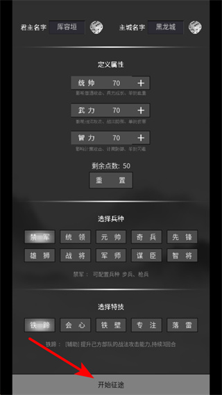 1、完成屬性加點(diǎn)與選擇后,點(diǎn)擊開(kāi)始征途按鈕開(kāi)啟關(guān)卡,這是進(jìn)入戰(zhàn)斗流程的關(guān)鍵操作,準(zhǔn)確點(diǎn)擊才能進(jìn)入戰(zhàn)局。