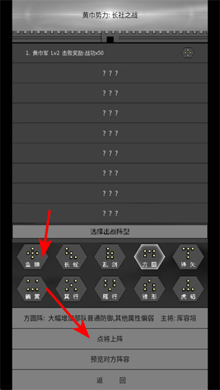 2、游戲中依照箭頭指引選擇出戰(zhàn)陣型,點(diǎn)擊對(duì)應(yīng)陣型圖標(biāo),這是確定戰(zhàn)場(chǎng)布局的操作,選擇后可進(jìn)入點(diǎn)將環(huán)節(jié)。