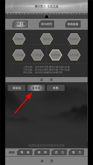 3、緊跟提示點(diǎn)擊皇甫嵩武將,將其選入上陣列表,這是配置出戰(zhàn)武將的核心操作,選將后可進(jìn)行陣型預(yù)覽。