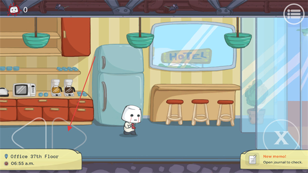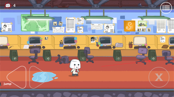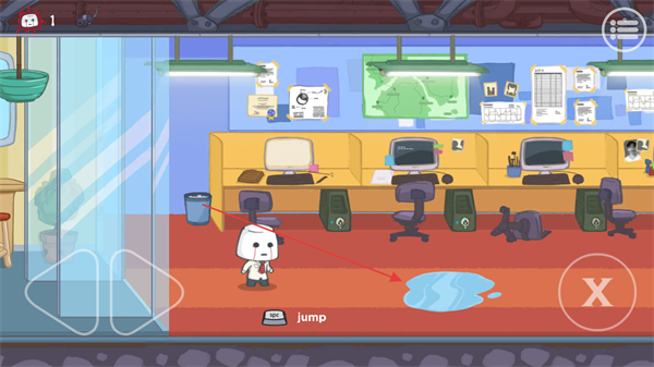 3、在辦公室場(chǎng)景點(diǎn)擊jump跳躍,避開地面水漬等障礙,繼續(xù)探索區(qū)域。