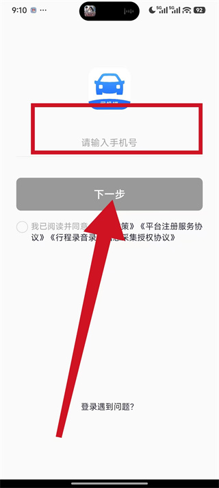 2、在手機號輸入頁面,填寫司機的手機號碼,勾選相關(guān)協(xié)議后點擊下一步,進(jìn)入驗證環(huán)節(jié)。