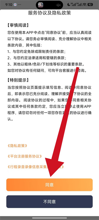 1、打開美團出租司機,在服務(wù)協(xié)議及隱私政策頁面點擊同意,進(jìn)入賬號注冊的信息填寫頁面。