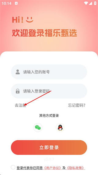 2、在福樂(lè)甄選登錄頁(yè)面,點(diǎn)擊去注冊(cè)選項(xiàng),進(jìn)入注冊(cè)信息填寫(xiě)頁(yè)面。