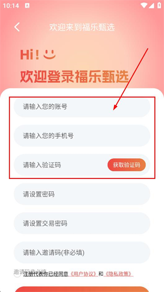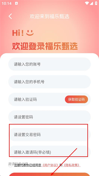 4、繼續(xù)填寫(xiě)密碼、交易密碼,選填邀請(qǐng)碼,點(diǎn)擊注冊(cè)按鈕,完成福樂(lè)甄選的賬號(hào)注冊(cè)。