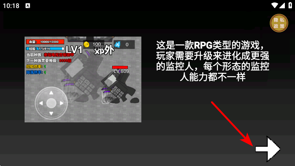 1、進(jìn)入游戲后,點(diǎn)擊箭頭指引的按鈕,這是跳過(guò)游戲介紹的關(guān)鍵操作,點(diǎn)擊后即可進(jìn)入游戲的核心玩法界面。