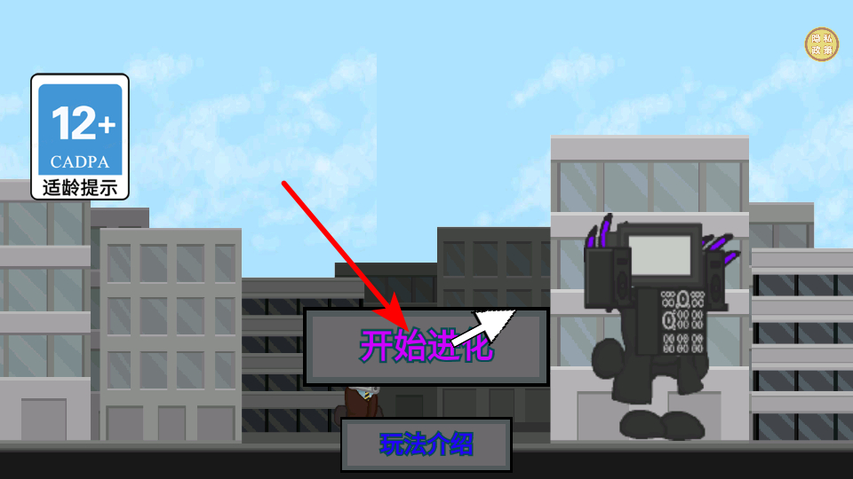 2、找到箭頭標(biāo)注的按鈕,點(diǎn)擊它開(kāi)啟進(jìn)化流程,這是進(jìn)入游戲主玩法的基礎(chǔ)操作,點(diǎn)擊后即可開(kāi)始監(jiān)控人的成長(zhǎng)。