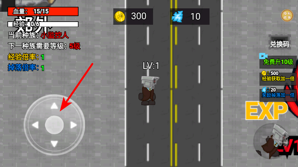 3、操作箭頭指向的搖桿,這是控制監(jiān)控人移動(dòng)的核心操作,拖動(dòng)后可讓角色向目標(biāo)區(qū)域行進(jìn)以獲取經(jīng)驗(yàn)和資源。