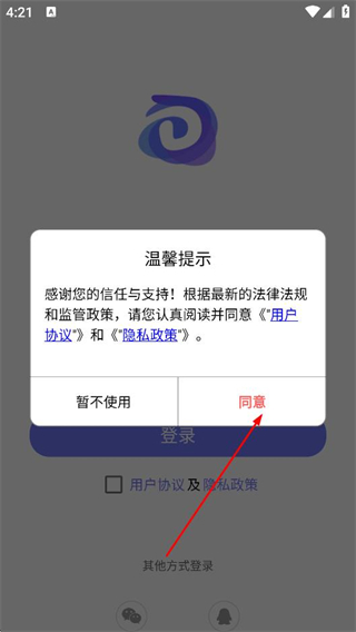 1、在該APP的溫馨提示彈窗中,點(diǎn)擊同意,進(jìn)入APP的登錄頁面。
