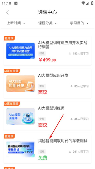2、在選課中心頁(yè)面,選擇揭秘智能網(wǎng)聯(lián)時(shí)代的車(chē)載測(cè)試課程進(jìn)入詳情頁(yè)。